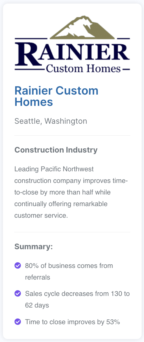 It is now easy to keep everyone involved in a project (the team, external partners, and clients) on the same page at every sales step. As a result, Rainier Custom Homes’ clients now receive a consistent and satisfactory experience—significantly reducing their time-to-close by 53%.